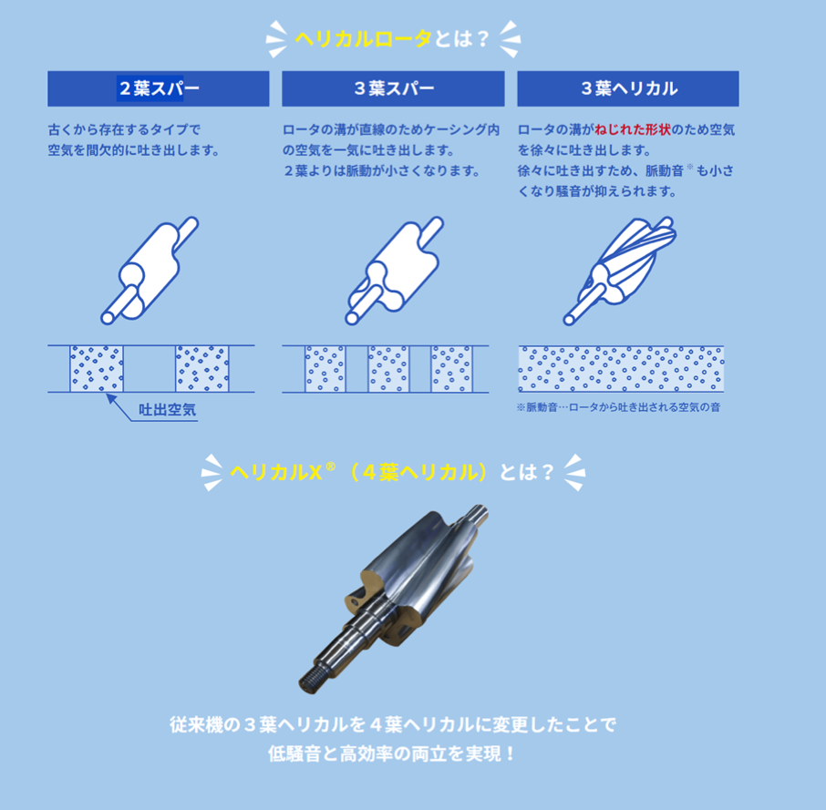 一方で、水位変動が激しい調整槽や、中小規模の現場では、圧力変動に強いルーツブロワの需要も根強い。新明和は、このルーツブロワにおいても革新的な進化を遂げている。それが ヘリカルX(エックス) だ。